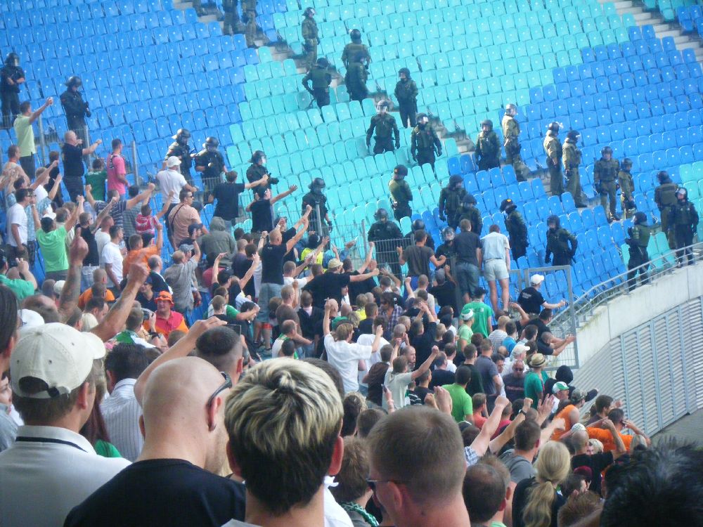 Bericht: Das Oberliga-Spiel war für diese Liga auf einem wirklich ansehnlichen Niveau, wobei Chemie sicherlich den Sieg verdient gehabt hätte. Doch Norman Lee Gandaa versäumte es kurz vor der Halbzeit, den Ball aus drei Metern ins leere Tor zu befördern. Das Fanverhältnis im Stadion dürfte bei 9.000 zu 6.000 zugunsten der Blau-Gelben gelegen haben, was die Lautstärke betrifft war es aber ausgeglichen. Auf den Rängen blieb es fast ausschließlich bei Beleidigungen, nur ein Lok-Fan kletterte über einen Zaun in den Pufferblock und wurde dann rigoros von den Sicherheitskräften mit Tränengas eingenebelt. Nach dem Spiel kam es zu den üblichen Ausschreitungen, die sich aber nach Fanangaben diesmal in Grenzen hielten. Das Aufeinandertreffen vor dem Stadion hätte durch Absperrungen sicher locker verhindert werden können. Komischerweise schritt die Polizei erst ein, als die Fangruppen schon längst aufeinander trafen.