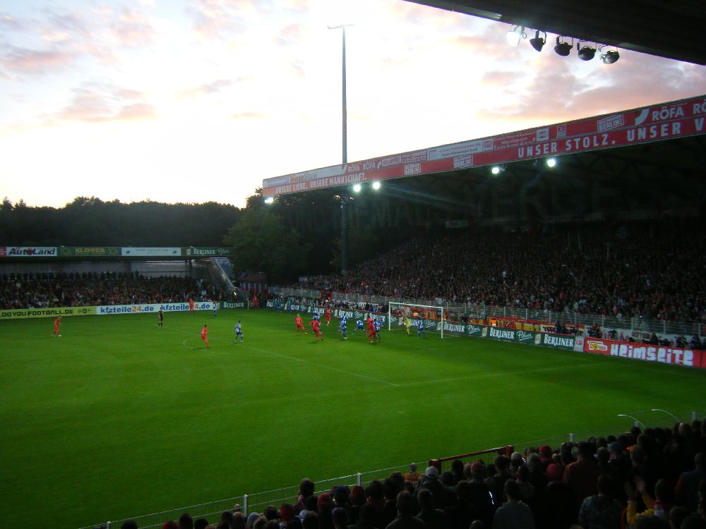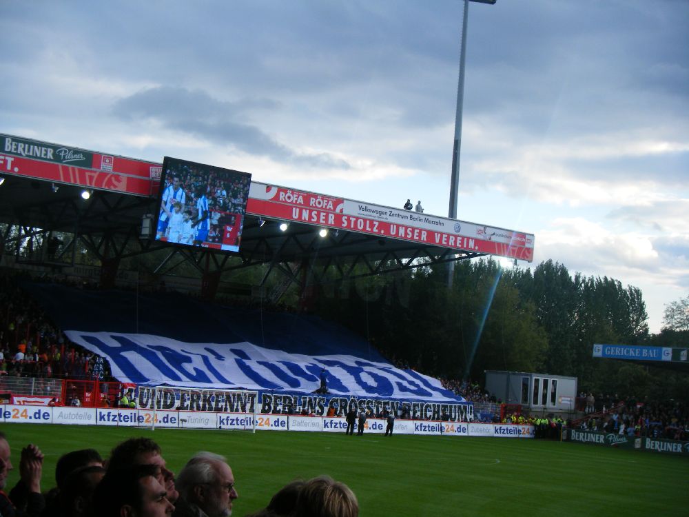 Bericht: Nach dem Neueröffnungsspiel gab es nun wieder das Derby – das erste um Punkte seit 60 Jahren. Hertha ging als klarer Favorit ins Spiel und auch gleich früh in Führung, anschließend stellten sie das Offensivspiel allerdings so gut wie ein. Der späte Ausgleich durch Kolk war aufgrund des Einsatzes und des Willens mehr als verdient. Die Stimmung war gut, aber es war keine überhitzte Derbyatmosphäre. Und von Hass oder ähnlichem Mist, wie es die Presse die ganze Woche heraufbeschwören wollte, war nichts zu spüren. Zu Beginn die Heimseite mit cooler S-Bahn-Choreo, der Gästeblock mit Berlin- und dann mit Hertha-Fahne überspannt. Letztere nebelten anfangs der zweiten Halbzeit fast das gesamte Stadion ein. Der Rauch stank, passend dazu der Spruch „Das ist die Berliner Luft“. Sehr geile Aktion!