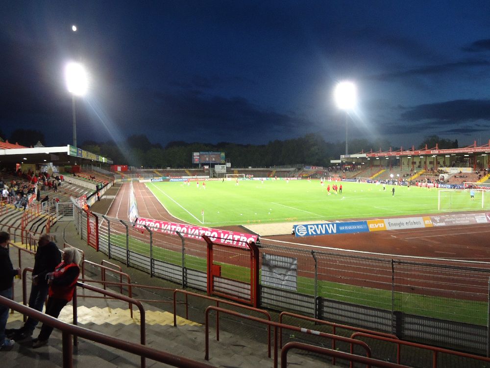 Bericht: Es ist Montagabend, Sport1 überträgt live, doch es handelt sich diesmal nicht „um die stärkste zweite Liga aller Zeiten“, sondern um Malocherfußball in Liga vier. Mit Rot-Weiß Oberhausen und Fortuna Köln duellierten sich zwei Traditionsmannschaften im Stadion Niederrhein, welches nach wie vor zu meinen persönlichen TopTen-Stadien in Deutschland zählt und überhaupt weckt RWO bei mir ausgesprochene Sympathie – ein klassischer Arbeiterklub aus’m Pott mit kleinem, aber treuem Publikum und ehrlichem, bodenständigem Fußball. Das Spiel begann schon vor Anpfiff recht munter, als der Bus mit Kölner Fans auf dem Stadionvorplatz anhielt, die Fortunen raussprangen und sich sofort eine kurze, aber heftige Schlägerei mit wartenden RWO’lern lieferten. Als die wenigen Polizisten irgendwann mal doch einschreiten wollten, war die Sache schon wieder erledigt und die Fighter waren bereits wieder damit beschäftigt, ihre davongetragenen Blessuren zu versorgen. Im Stadion zeigte der mit knapp 200 Mann gut gefüllte Gästeblock zu Spielbeginn ein kleines Fahnenmeer, um sich im Rest des Spiels mit dem etwa gleich großen Oberhausener Stimmungsmob auf Augenhöhe zu messen. Einfacher, aber guter Auftritt beider Seiten. Das Spiel nahm nur langsam Fahrt auf, doch ab Mitte der ersten Halbzeit wurde es zum Teil hektisch und ruppig, wozu auch die manchmal fragwürdigen Schiedsrichterentscheidungen beitrugen, der Funke sprang vom Feld auf das Publikum über und so wurde rege gebrüllt und gepöbelt. Am Ende siegte RWO verdient und konnte sich etwas von den Abstiegsrängen entfernen, während es Fortuna Köln versäumte, an Spitzenreiter Viktoria Köln dranzubleiben.