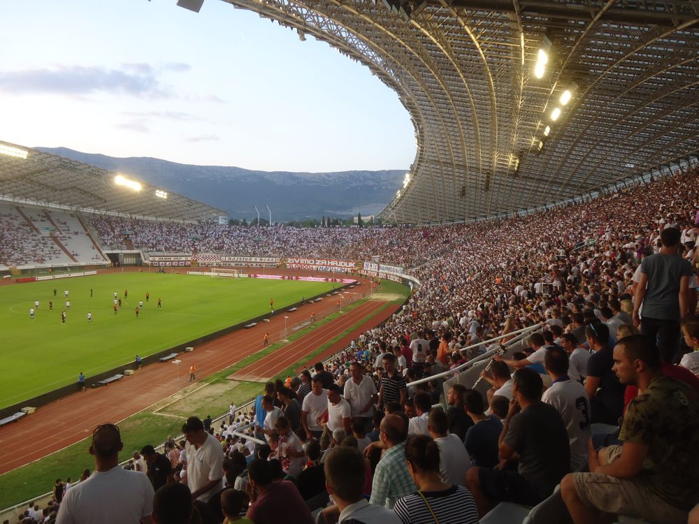 Bericht: Nach dem Hajduk-Besuch vor zwei Jahren verschlug es mich nun erneut an die dalmatinische Küste in den Urlaub, was selbstverständlich damit verbunden wurde, das Stadion Poljud mit meiner Anwesenheit zu beglücken. Jenes ist nach wie vor ein Schmuckstück, zwar mit Laufbahn, dafür mit Blick auf das Mittelmeer – dieser Fakt sticht so gut wie alle anderen Stadien aus. Heute war wieder Europa-League-Qualifikation angesagt und zu Gast war der FK Shakhter aus Karagandy in Kasachstan.