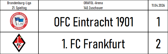 Bericht: Gutes Duell am 21. Spieltag. Der formstarke OFC empfing den Tabellenzweiten aus der Oderstadt und ging dabei insbesondere nach dem Derbysieg in Sachsenhausen selbstbewusst zur Sache. In einem ausgeglichenen Spiel ging es mit einer Führung in die Pause, ehe nach dem Seitenwechsel die Frankfurter ausglichen.